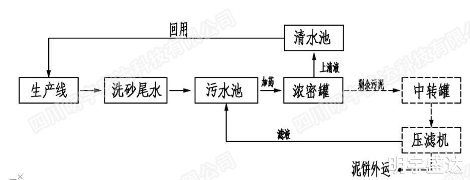生產(chǎn)加工過程中需要進(jìn)行洗砂操作以便從原料中分離出成品砂石,期間會(huì)產(chǎn)生洗砂尾水。洗砂尾水的主要污染物指標(biāo)是懸浮物,懸浮物大量存在形成泥渣水,從而導(dǎo)致水體污染,無法循環(huán)使用。根據(jù)要求,需要對(duì)生產(chǎn)廢水進(jìn)行處理,達(dá)到環(huán)保要求。項(xiàng)目考慮將處理后的廢水進(jìn)行回用。