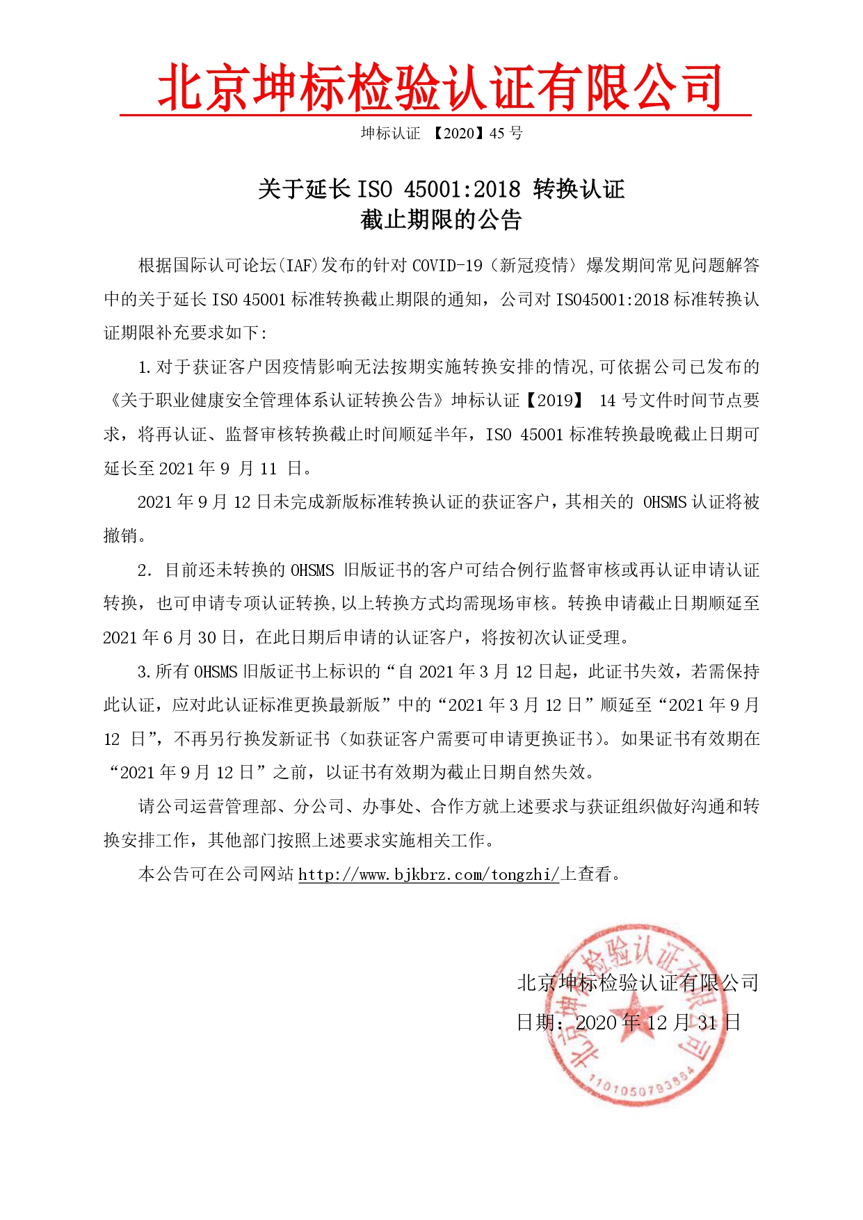 關于延長 ISO 45001:2018 轉換認證 截止期限的公告